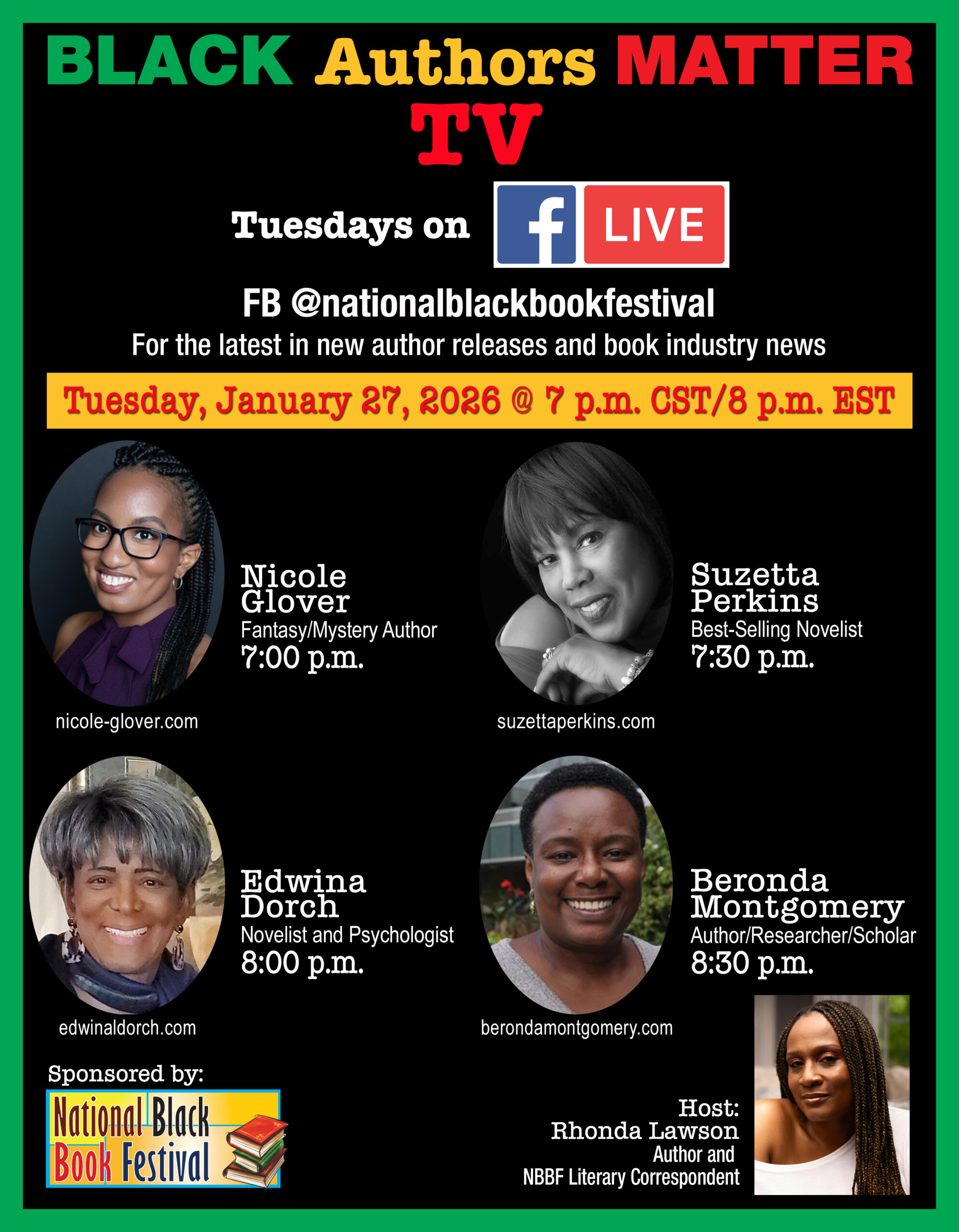 Black Authors Matter TV is a weekly, live-streamed program where authors (new and old), publishers, bookstore owners, book club facilitators, book marketers, and other movers and shakers in the African-American literature arena are interviewed. BAM TV is live-streamed every Tuesday on the National Black Book Festival's Facebook page from 7 to 9 pm CST.